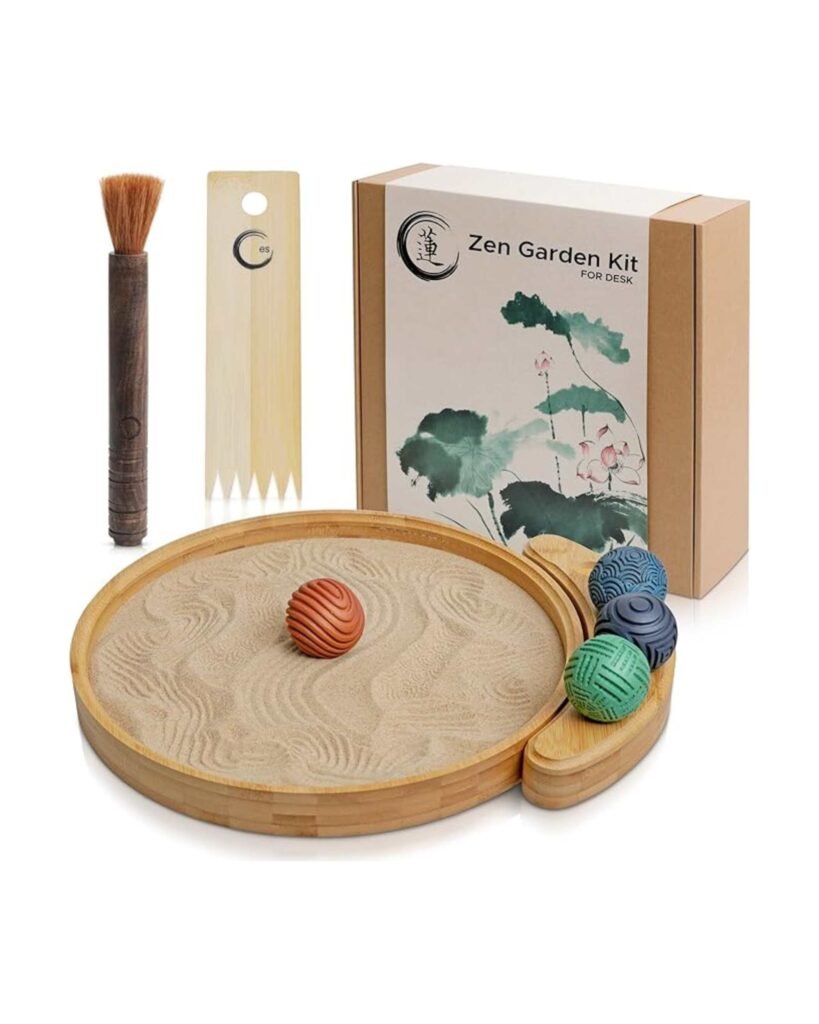 Elegant zen garden for your desk, for whenever you need a mindful break. Comes with four spheres, a rake, and a brush.