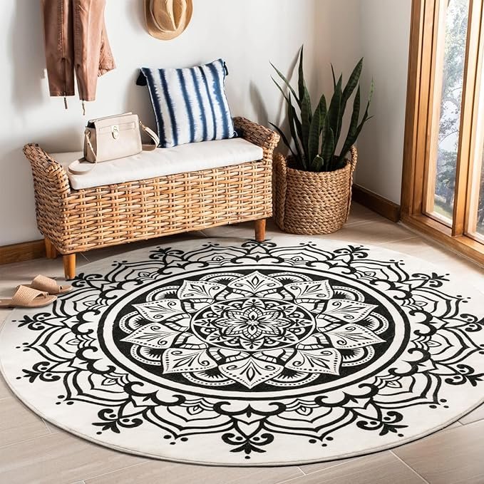 Soft area rug that is spill and stain resistant. Bohemian style round rug is easy to fold and unfold, and can be washed with cold water on gentle cycle. There are different variations of these mandala rugs, and some are very colorful.
