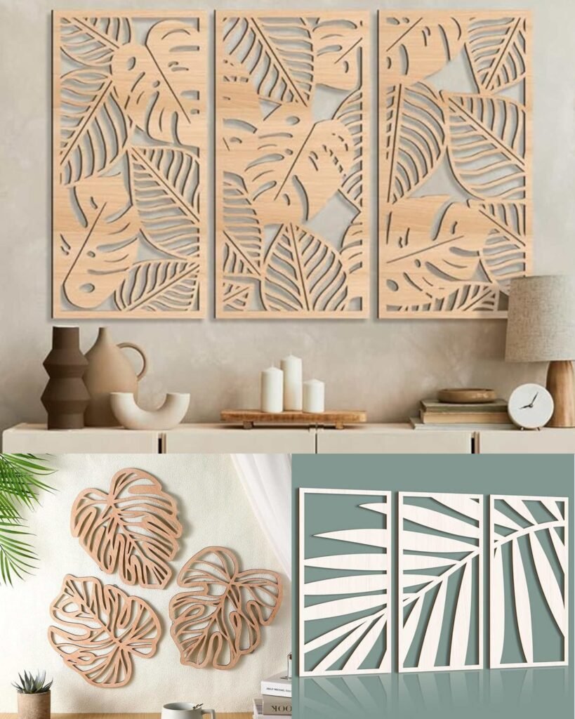 Beautiful Wooden Wall Art with a tropical rainforest palm leaf design, and big monstera leaves.