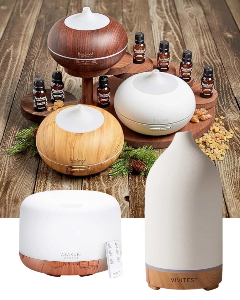Stylish devices that diffuse essential oils into the air. Essential oils are said to have a variety of benefits, such as promoting relaxation, stress relief, and improving mood.